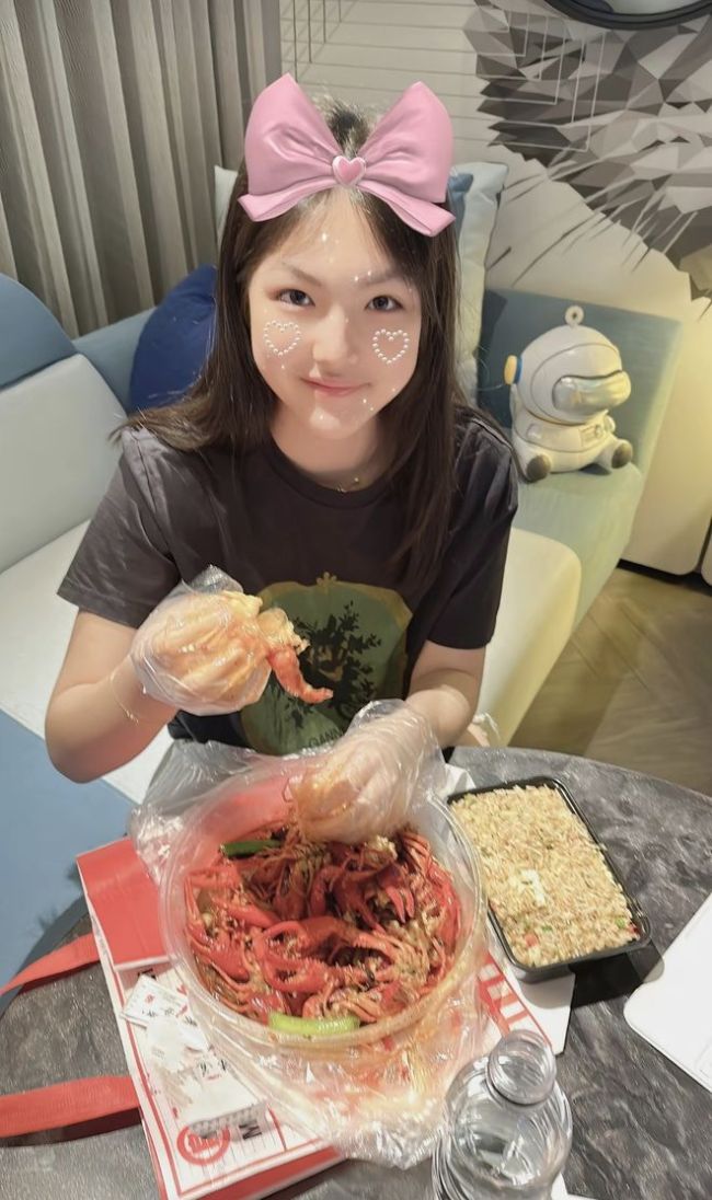 李湘拍下女儿吃小龙虾的照片,网友表示终于买得起王诗龄同款了。