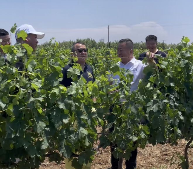 他们跟随着曾志伟,在酒庄里参观和交流。曾志伟一边听取旁边穿白色上衣的男子的介绍,一边仔细观察着葡萄园的情况。他看起来很满意,也很开心。