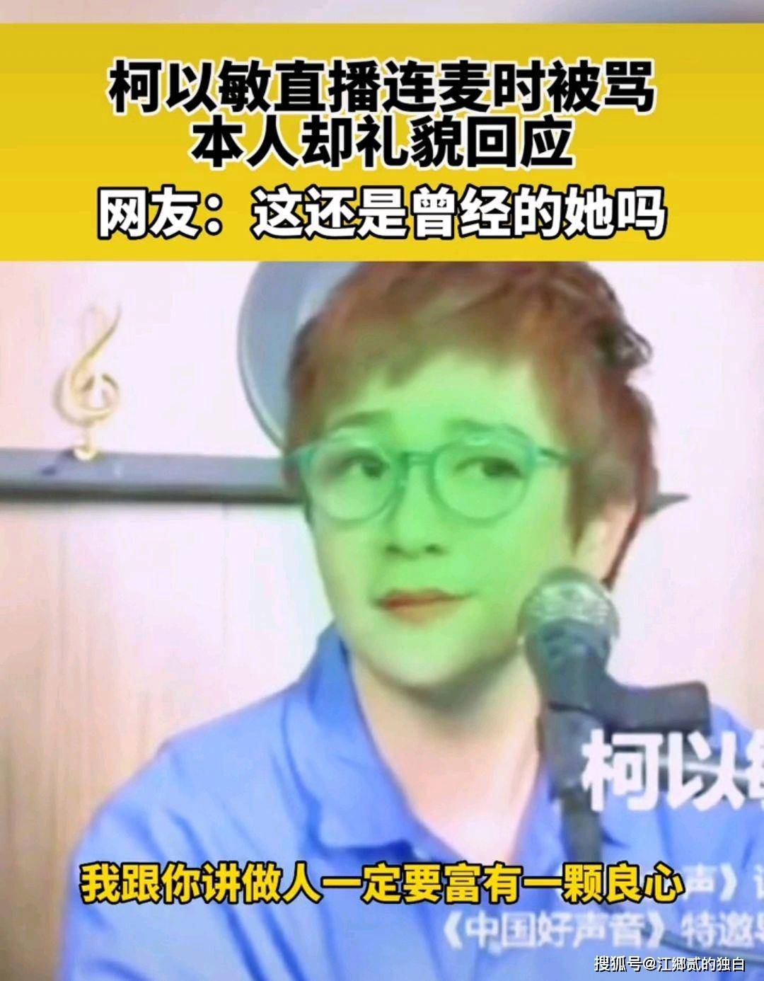 第一个是,当柯以敏被人上麦咒骂的时候,助手对此事给出了一个评论:“我跟你讲,做人一定要富有一颗良心。”