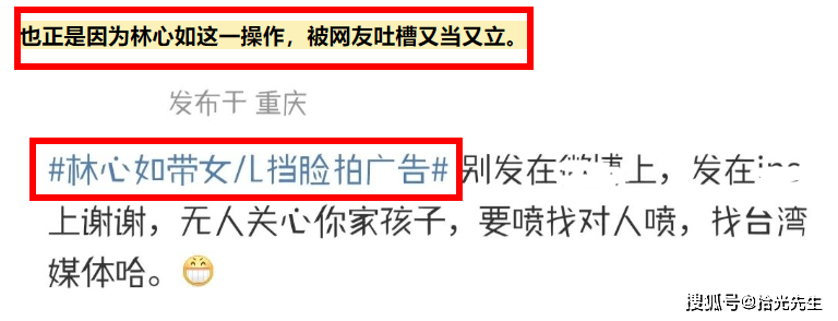 事情的起因就是林心如在宣传片中用手捂住女儿脸颊的一幕,被网友吐槽又当又立。
