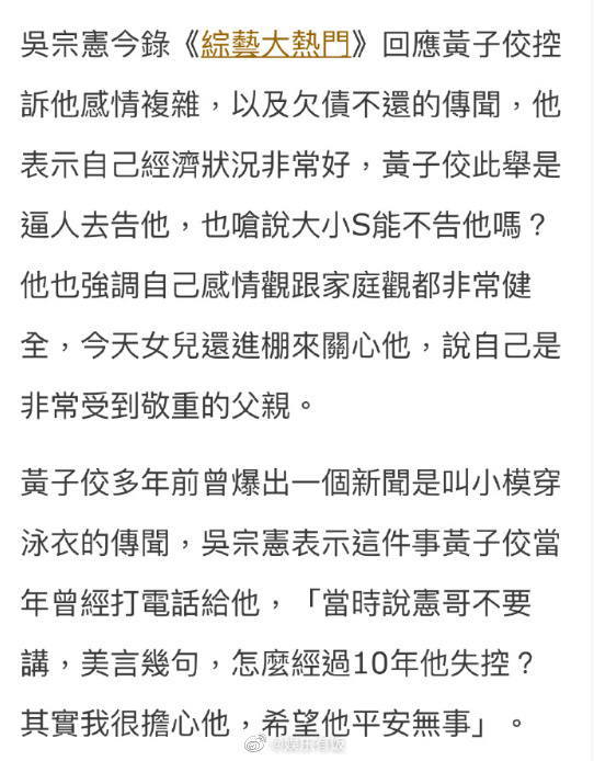 吴宗宪表示这件事黄子佼当年曾经打电话给他说,“宪哥不要讲出去,帮我美言几句,怎么经过10年他搞失控?其实我很担心他,希望他平安无事”。