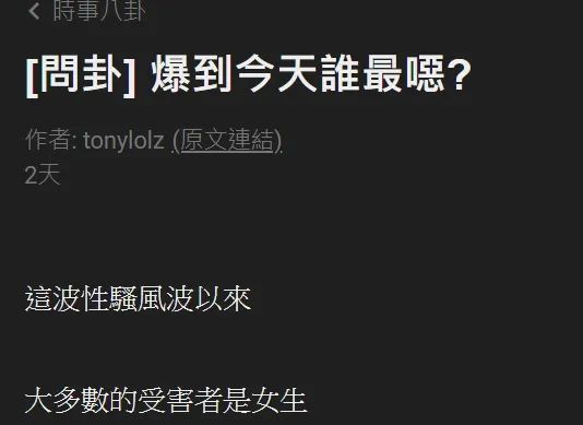有网友发文询问,「爆到今天谁最恶?」他说,这波性骚风波以来,大多数的受害者是女生,但也有男生受害,有趣的是,加害者好像都是男的?女的加害者好像不多,董神也说蕾拉是节目效果,那么这些案例中又是谁最恶呢?
