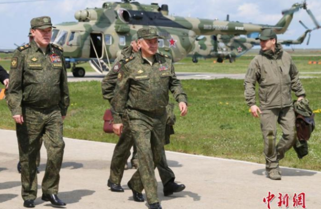 资料图:俄罗斯国防部发布消息称,俄军在克里米亚地区举行大型跨军种演习。期间,俄罗斯国防部长绍伊古(左二)前往演习现场视察。中新社发 俄罗斯国防部供图