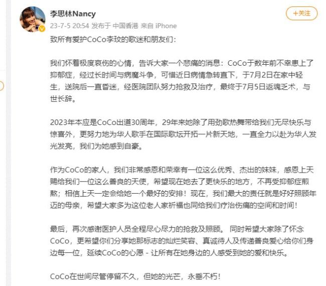 7月5日,李玟的家人李思林发文宣告李玟去世。李思林透露CoCo于数年前不幸患上了抑郁症,经过长时间与病魔斗争,可惜近日病情急转直下,于7月2日在家中轻生,送院后一直昏迷,经医院团队努力抢救及治疗,最终于7月5日返魂乏术,与世长辞。
