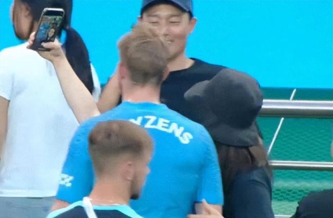全智贤还和德布劳内自拍了,老公默默站在旁边陪她追星。