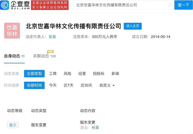 企查查APP显示,近日,北京世嘉华林文化传播有限责任公司发生工商变更,杨幂退出股东行列。