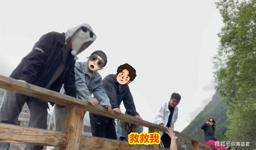 女子选择了一侧架好相机,小伙伴们一排站好,大家双手高举,然后一起从身前划过趴在栏杆上。