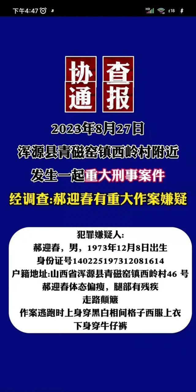 随后,当地警方发布了悬赏通告,从通告内容可以得知,凶手名叫郝迎春,西岭村本地人,生于1973年12月8日,今年50岁,身份证号为140225197312081614。他身材瘦小,腿部有残疾,走路有点颠簸。