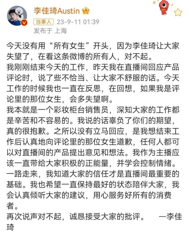 9月11日,针对直播间不当言论,9月11日凌晨,李佳琦微博发文,就10日晚上直播间内因网友嫌眉笔太贵回怼对方的行为道歉,他表示,自己在直播间回应产品评论时,说了不恰当、让大家不舒服的话后,也一直在反思,在回想:“如果我是评论里的那位女生,会多失望啊。”李佳琦称,他会认真向该女生道歉,诚恳接受大家的批评。