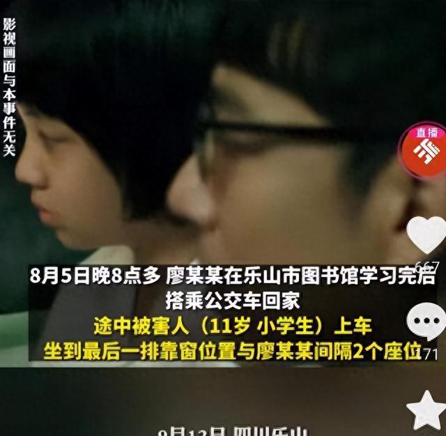 8月5号晚上八点多,27岁的男子廖某某在乐山市图书馆学习完后,搭乘公交车回家。公交车行驶的站点,一位11岁的小学生上了公交车,坐在最后一排靠窗的位置。