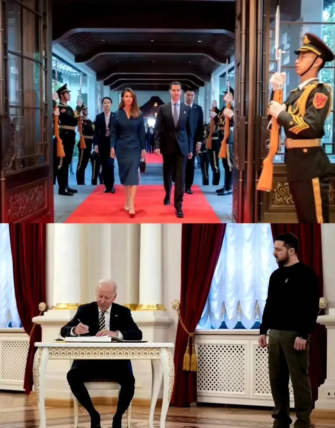 为什么“太危险”?因为,美国一直想暗杀他,他只要出了叙利亚,甚至到了美军控制的叙利亚地盘上,就有可能被暗杀。而且,由于美国对叙利亚及阿萨德进行了严厉制裁,大部分国家都不敢得罪美国,所以他的飞机很难通过很多国家。那又为什么说阿萨德这次访华又“太安全”了呢?因为,他访问的是中国!中国给他所做的安全考虑,曝光后震惊了世界!在阿萨德夫妇安全回国后,关于他们访华的过程逐渐都曝光了。为了确保阿萨德总统夫妇和孩子们,以及叙利亚数百人的访问团能安全访华,中国不但派了中国国际航空公司的专机接送,还采取了一系列其它措施。其中有一件事曝光后,所有网友都惊呼:真的太牛了!阿萨德总统这次访华的线路是经过精心选择的,经过了四个国家,分别是约旦、沙特、伊朗和巴基斯坦。为了确保他们安全,这四个国家当中,有三个国家出动了战机为其护航,回到叙利亚境内则是俄罗斯战机护航,确保了阿萨德总统夫妇访华的绝对安全。具体过程大概是这样的:阿萨德总统夫妇启程访华,国航专机起飞后,俄罗斯的战机就负责护航,一直到约旦边境。约旦与叙利亚关系很好,再加上又是内陆国家,整体很安全。飞过约旦,阿萨德专机到了沙特,作为几年前还是敌对国家的沙特,这次在中国的斡旋下专门派战机给阿萨德总统护航,沙特战机一直将阿萨德总统护航到伊朗边境。接着,伊朗战机起飞负责为阿萨德总统护航,伊朗的战机再护航到巴基斯坦边境,巴基斯坦战机接着继续护航,又将阿萨德总统的专机护航到中巴边境。到了中国上空,就绝对安全了。阿萨德总统夫妇结束访华返回,先是巴基斯坦战机护航,接着是伊朗战机护航,再接着是沙特接力护航,飞过约旦到了叙利亚境内,又是俄罗斯战机护航,直到飞机降落大马士革机场。这样的过程,真的是让全球侧目,因为所有国家都看到了中国对待朋友的方式,他们一定会做一些对比。就在近期,中美对待朋友的照片就在互联网上刷屏了。请看下面:第一张照片,是叙利亚总统巴沙尔·阿萨德夫妇访华中方接待时的照片。打眼一看就知道,中方做了精心的接待策划。崭新红毯铺路,走廊和大门前,雄壮的中国卫兵列队整齐,手举钢枪致礼。每一个细节,都体现着中国的礼仪之邦和对阿萨德总统夫妇的尊重。阿萨德总统夫妇身着正装、仪表庄重,迈着轻松自信的步伐。在阿萨德总统左胸,别着是第一夫人亲手别上去的一枚胸章。再看第二张照片,乌克兰总统泽连斯基近日访美与拜登的留影。照片中,只见拜登端坐桌前签署文件,泽连斯基总统衣着随便、表情凝重,侍立在拜登旁边,眼睛直勾勾地盯着拜登手里的笔,一副战战兢兢唯恐对方反悔不签的模样。阿萨德总统访华,中国以最为尊重的方式接待,甚至为了确保安全负责接送,乃至协调沿途国家飞机护航。这次访华,中叙两国元首不但共同宣布建立战略伙伴关系,中国还给叙利亚送去了百亿美元的投资。不要忘了,叙利亚是一个石油、天然气和各种矿产资源非常丰富的国家,2010年人均GDP高达1.13万美元,是美国对叙利亚的打击和破坏,才导致叙利亚损失了上千万人口,以及人均GDP降低到了2020年的537美元。现在,中国已经在叙利亚投资了数十亿美元,接下来还有继续大规模投资,这是给叙利亚雪中送炭啊!反观美国,拜登批的是给予乌克兰3.5亿美元军事援助。现在,美国挑起的俄乌战争已经让这个国家分崩离析,同样被炸得一片废墟。然而,美国依然在递刀子,要乌克兰战斗到最后一个乌克兰人。乌克兰替美国打代理人战争,泽连斯基却像孙子一样向拜登乞讨。