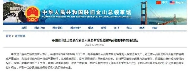 中国驻旧金山总领馆发言人表示,当地时间2023年10月9日下午,有不明身份人员驾车暴力冲撞闯入我馆证件大厅,对工作人员及现场民众生命安全构成严重威胁,对我馆设施与财产造成严重破坏,性质极其恶劣。目前犯罪嫌疑人已被警方控制。我馆严厉谴责这起暴力袭击事件,保留追究事件相关责任的权利。我馆已向美方提出严正交涉,要求迅速查明真相,依法严肃处置,并敦促美方按照《维也纳外交关系公约》《维也纳领事关系公约》和《中美领事条约》规定,采取一切必要措施确保总领馆人员及馆舍安全。