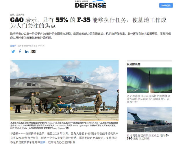 而在另一份由美国政府问责办公室出具的调查报告中,F-35更是被曝有多达45%的机体不具备执行任何任务的能力。可以说在这两份调查报告的相互佐证之下,F-35战斗机存在的一系列勤务问题被暴露无遗。所谓的世界第一大隐身战斗机机队,其作战能力并非很多人想象的那般强大。