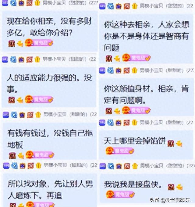 芮甜甜榜一大哥“宝贝哥”也是调侃,像芮甜甜这样的颜值身材条件还去相亲,人家会想是不是芮甜甜身体还是智商有问题。
