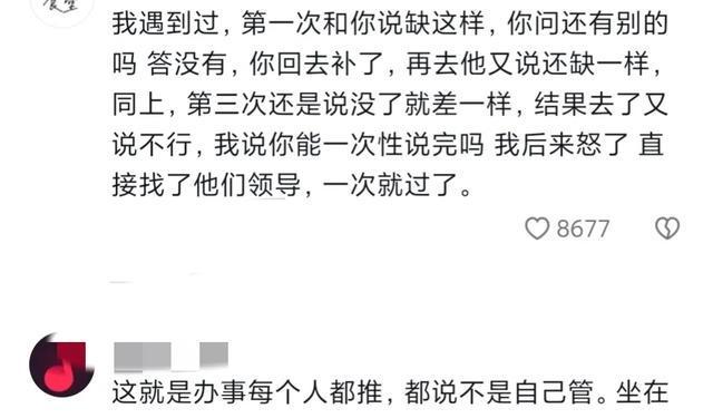 有的网友表示: 我就我遇到过,第一次和你说缺这样,你问还有别的吗 ,答没有,你回去补了,再去他又说还缺一样,同上,第三次还是说没了就差一样,结果去了又说不行,我说你能一次性说完吗? 我后来怒了,直接找了他们领导,一次就过了。