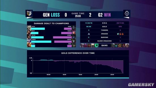 双方中路爆发团战GEN狗熊想要独自一人切入后排,但G2洛直接配合队友将其击杀,随后展开追击在击杀GEN最后一人后一波结束了比赛,恭喜G2!