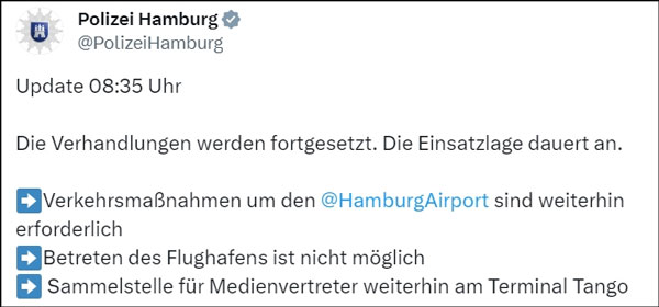 汉堡机场仍处于封闭状态,不允许进入,附近实施交通管制。警方让所有媒体待在Tango航站楼里,并呼吁乘客和其他市民远离机场,“空中交通暂停,等待进一步通知”。