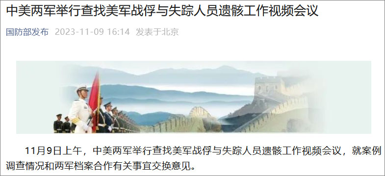 据微信公众号“国防部发布”消息,11月9日上午,中美两军举行查找美军战俘与失踪人员遗骸工作视频会议,就案例调查情况和两军档案合作有关事宜交换意见。