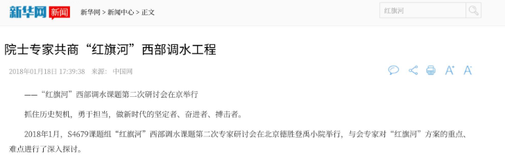 2018年,新华网一篇题为《院士专家共商“红旗河”西部调水工程》的报道文章,正式澄清了此前有关红旗河工程是民间谣言的声音。