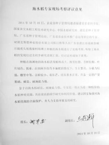 我认为,(陈日胜)海水稻是一个非常宝贵的水稻种质资源,具有很高的科学研究和利用价值,与(我)当年发现的野生水稻不育资源有着类似的战略意义。