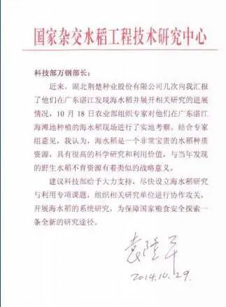 在消息传出后,被誉为“中国杂交水稻之父”的中国工程院院士袁隆平,当即向时任国家科技部部长的万钢亲笔书信称: