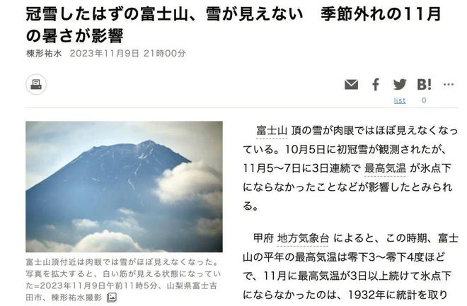 对此有在日本的网友表示:这简直是危言耸听,最重要的原因是今年热的不正常,都没想过会在11月穿卫衣还热得冒汗。也说明全球在变暖,现在全世界炮火连天,就算富士山喷了,有钱的日本人也会搬家。