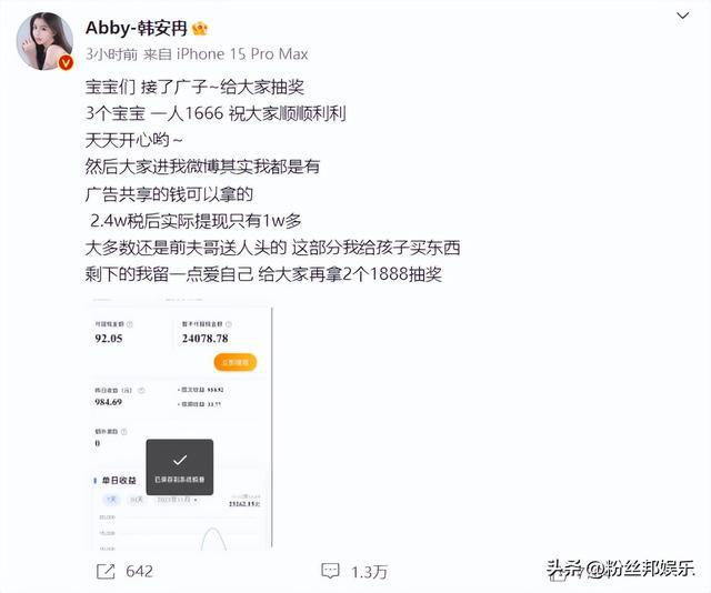 “三婚三离”不值得学习,韩安冉发文一心赚钱,一天承接多个广告