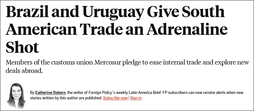 美国《外交政策》杂志网站报道:巴西和乌拉圭为南共市贸易打了一针强心剂