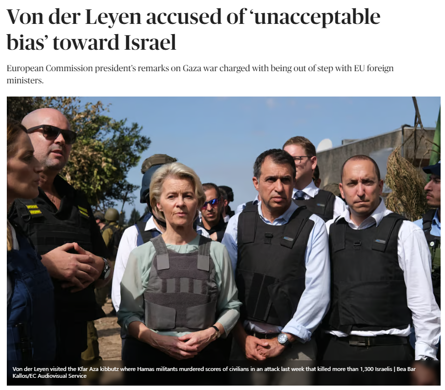 如在10月13日,冯德莱恩和欧洲议会议长梅措拉在以色列军队装甲车的重重护卫下访问了靠近加沙的犹太人定居点卡法阿扎,并公开表示此次访问属于正式官方访问,其目的是为了“表达对以色列人民的声援”和支持。