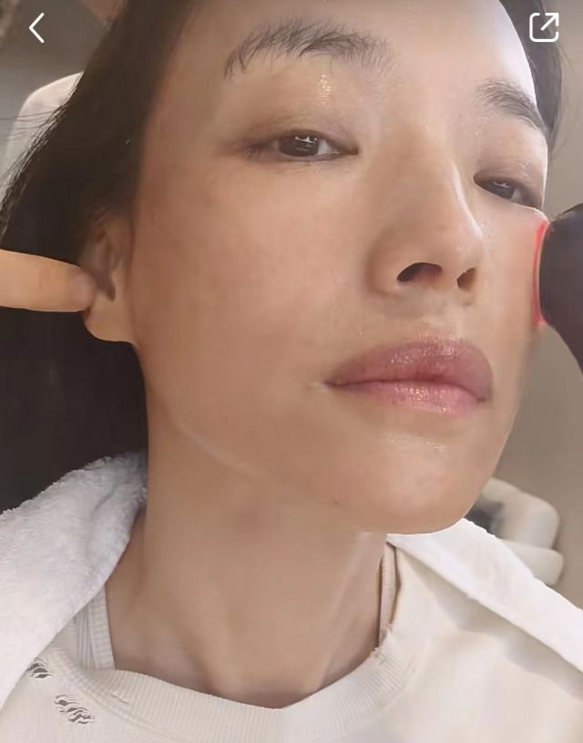 晒出的vlog里,舒淇正在舒舒服服地护肤,她将镜头怼着自己的脸蛋儿,整个五官放大,一览无余。