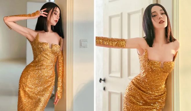 迪丽热巴今晚造型一身金光闪闪。