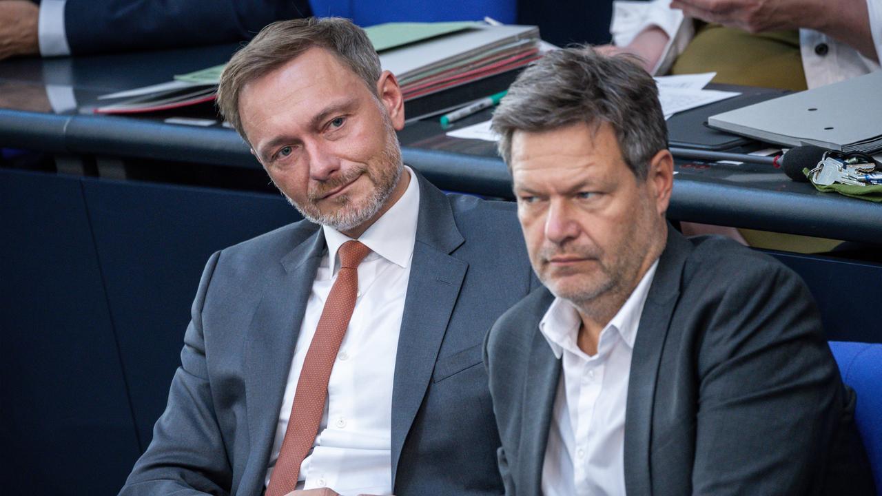 联合执政的自民党与绿党就如何填补预算缺口存在分歧,图为财政部长林德纳(左,自民党党魁)与副总理、经济部长哈贝克(右,绿党党主席)