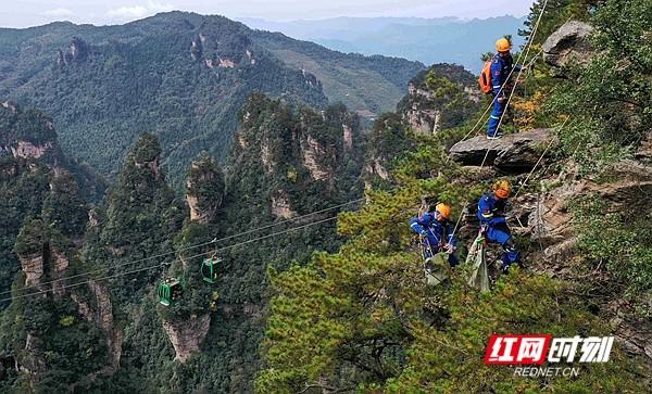 今日,在湖南张家界国家森林公园黄石寨景区,张家界市蓝天救援队志愿者系上安全绳,行走在悬崖绝壁上捡拾丢弃的塑料袋、水瓶等垃圾,用自己的实际行动呼吁广大游客关爱世界自然遗产,共同保护生态环境。