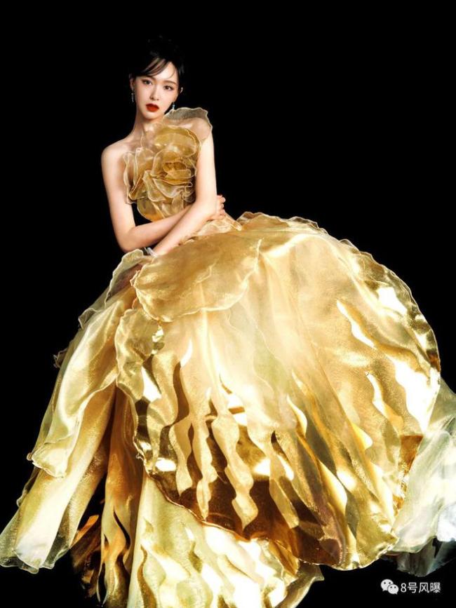 唐嫣的整体造型令人眼前一亮,金色花瓣裙对应了即将要上的新作品《繁花》。