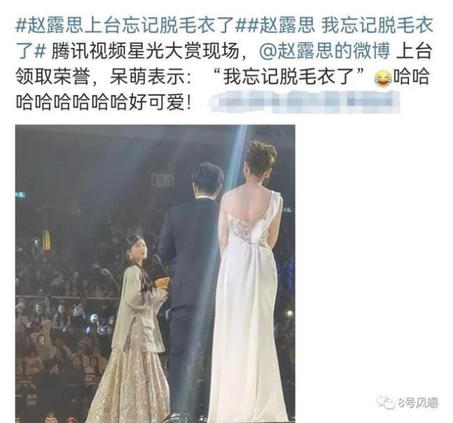 赵露思在内场上台领奖环节,穿着毛衣就走上了台,在发言时真诚坦露:我忘记脱毛衣了。