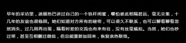 如此优秀的人儿,人生当中自然也会有几位好友的相伴。在采访的过程中,迪丽热巴也强调自己有一个铁杆闺蜜,两人已经有了十几年的友谊了,她们也知道彼此的所有秘密,两人可以很久不联系,也可以聊着聊着突然就消失了。