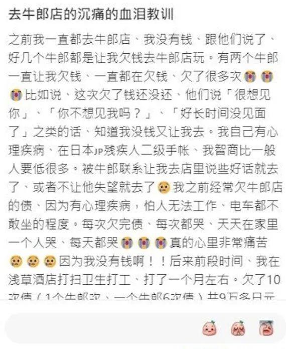 小编从女生的文字中了解到。她患有心理疾病,在日本拿残疾人二级手帐,自述智商比一般人低,表示在日本没有工作,没有朋友。不知从什么时候开始,选择去牛郎店寻找慰藉。大家也知道,牛郎店里的牛郎擅长哄人跟逢场作戏,于是让不少女生深陷其中。