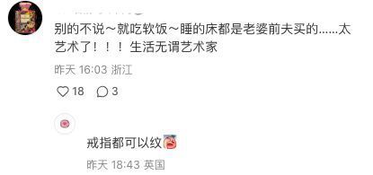 然而,随着这番赞美的传播,一些网友显然对此感到不满,纷纷发表各种吐槽的言论。有人调侃道:“您对艺术家是不是有什么误解?”“尊重艺术家就说人家的大名。人家又不是赘婿”、“别的不说,就吃软饭,睡的床都是老婆前夫买的太艺术了!生活无谓艺术家”。