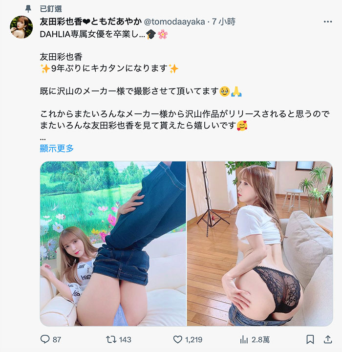 意思就是,她,友田彩也香离开了待了四年的Faleno集团,我个人是觉得非常了不起—诚如我之前和某个网友在版面上讨论的,友田所属的Diaz Group集团几年来非常弱小,为了留住女演员并且让她们待在最舒服的位置所以这家经纪公司真的过得很辛苦,对外他们想尽办法让女演员待在片商当专属女演员,对内他们给出业界最低的抽成,只是即便他们这么努力最后友田的专属女演员还是没了⋯
