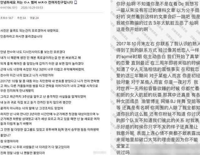 该女子揭发灿烈“时间管理大师”的行径,表示自己睡得一无所知的时候,灿烈忙着和其他女人一起肮脏的玩耍,两人交往期间,灿烈至少出轨十次,并表示灿烈身边的人都知道他的事,只有她和灿烈的粉丝不知道。