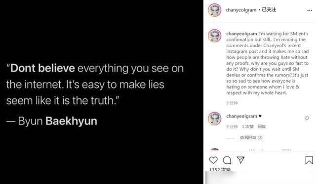 此前灿烈的粉丝页在社交平台回应传闻,并上传一张图片,表示:不要相信你在网上看到的一切,说谎很容易让人觉得这是事实!