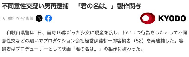 《你的名字》制片人因猥亵未成年少女被逮捕,网友:是有多寂寞