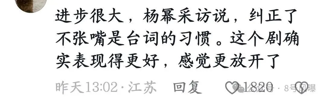 这次在新剧中表现不错,网友也称赞杨幂演技进步了很多,之前的台词不张嘴的习惯有看出改善。