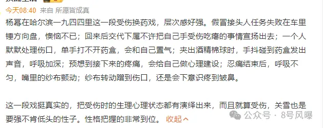 而关雪咬着纱布,即使剧痛也没有发出一点声音,额头冒汗、呼吸急促、眼神狠戾,这段表演生动地展现了外表美艳但内心强大的女特务的形象,也让网友表示“疼得不像演的”,“代入感很强”。