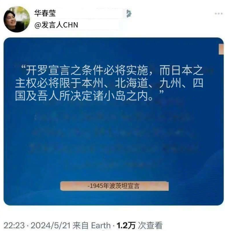另外从解放军的这次强烈反应,你也能大概猜出赖清德的发言究竟多离谱。这次的台海军演参与部队包括陆军、海军、空军、火箭军,囊括了解放军所有军种。根据东部战区发布的公告,空军的歼20、歼16战机,海军的052D驱逐舰和071船坞登陆舰,陆军的远箱火远程火箭炮、以及火箭军的东风系列均参加了演习。而军演的区域,包括台湾海峡,台岛北部、南部、东部。在2022年的台海军演中,解放军差点把台湾包圆了,但在澎湖方向留了一个口子,而这次是一个口子都没留,堪称是锁岛式军演。而在图中还画了4个小圆圈,标注的是金门岛、马祖岛、乌丘屿、东引岛周边,是目前台当局的实控区域,也首次列入了军演范围。两岸关系非常特殊,从法理上来说两岸其实一直处于战争状态,双方不仅有真实战争状态存在过,而且在国民党败退台湾后从未和大陆签订过任何停战协议,甚至从未签订过临时停战协议,严格来说双方随时可以发起进攻,都不需要提前告知那种。但这次声势巨大且事发突然的台海军演,台湾那边好像无人在意,到处歌舞升平,甚至在网上讨论大陆军演的台湾人都很少。有1450用这个在网上讽刺大陆军演是纸老虎,是吓唬人的,是没用的。军演就是准战争状态,历史上太多战争都是由军演开始,军队调动集结后某一刻突然就打起来的。所谓攻敌不备,人人都知道你要开战的时候才去开战那是很愚蠢的行为,在别人都认为你不会开战的时候突然开战才是兵家之道。每一次军演我们都收紧了一次台湾的空间,兵锋前线距离台湾越来越近,那在军政上这就是实打实的利益,现代大国争取利益很多都是采用的这种切香肠战术,每次切一片香肠,积少成多。而面对越来越近的解放军前锋,台湾从民众到官方都在歌舞升平,毫无紧张之意,这是好事啊。这和天天狼来了是一个原理,喊多了确实就无人在意了。但在某一天,如果军演到一半的时候突然转化为攻台命令,还在歌舞升平毫无紧张和准备的台湾当局将毫无还手之力。这么做是因为台湾对我们而言有特殊之处,那就是台湾只能速攻秒占,我们要的是一个完整的台湾,而不是一个被打烂的台湾,所以打台湾必须是闪电战。如果早晚要武统,那自然是对手越麻痹越好,一个风吹草动就全体警戒的台湾是不能打的,歌舞升平的台湾才能实现我们速攻秒占的战略目标。这次东部战区其实早在22日就已经用“熊孩子”来称呼台湾了,那你说这次不会打,只是吓唬吓唬,确实概率极大,但多次军演让台湾最终陷入毫无感觉麻痹大意的状态,这同样很有用。但是在我们打台湾必须速攻秒占之外,如果要武统,那战场绝对会不止是台湾,我们会在台湾之外大打特打,美国及其下属国想打多久就打多久那种。这次赖清德之所以敢如此猖狂的发表台独言论,除了有美国的支持外,还有日本的支持。日本不仅派出了31位跨党派国会议员组成的代表团参加赖清德的“就职典礼”,而且大放厥词,不仅再次表态所谓台湾有事就是日本有事,而且连把日本防卫台湾的新闻都写出来了。给你们翻译一下,看看日本外交部门说的话到底有多离谱,明确表态日本必将保卫台湾。对此中国驻日本大使吴江浩立即做出了警告,表示“如果日本将自己绑上分裂中国的战车,日本民众将被带入火坑”,还有的媒体把这个火坑翻译成了火海。火坑和火海表达的感情强弱程度不一样,但意思是一样的,这是历年来中国对日本发出的最强硬警告,一向和和气气不愿动武的中国从来不会说出这么军事强硬的话。对于中国驻日大使说的话,日本人极其震惊,估计他们做梦都没想到中国代表能说出这样的话,这和印象里的中国完全不一样,日本内阁官房长官林芳正称“中方大使有关言论极不恰当”,向中国官方表达强烈抗议。中国外交代表华春莹,在5月21日公开重申了1945年的“波茨坦公告”。里面写的是日本主权必将限于本州、北海道、九州、四国和吾人所决定的其他小岛之内。