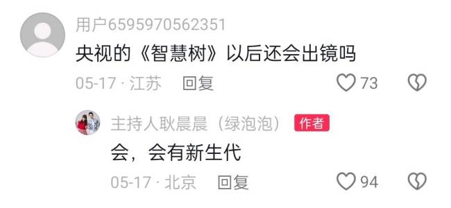近日,有网友发现央视《智慧树》节目现在就剩下“红果果”了,绿泡泡(耿晨晨)疑似已离开央视。有网友留言问绿泡泡:“央视的《智慧树》以后还会出镜吗?”他回复:“会有新生代。”