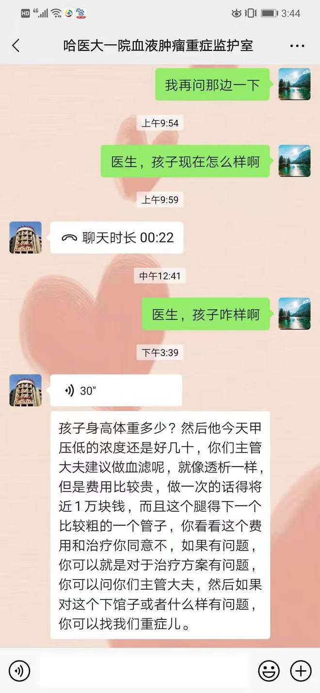 经过抽血检查,医生说孩子没有大问题,有些贫血,补充营养就好。我还是不放心,在邻居的建议下,5月20日,我带着建辉去了哈尔滨医科大学附属第二医院,做了一系列检查后,医生建议我们转院到哈尔滨医科大学附属第一医院。