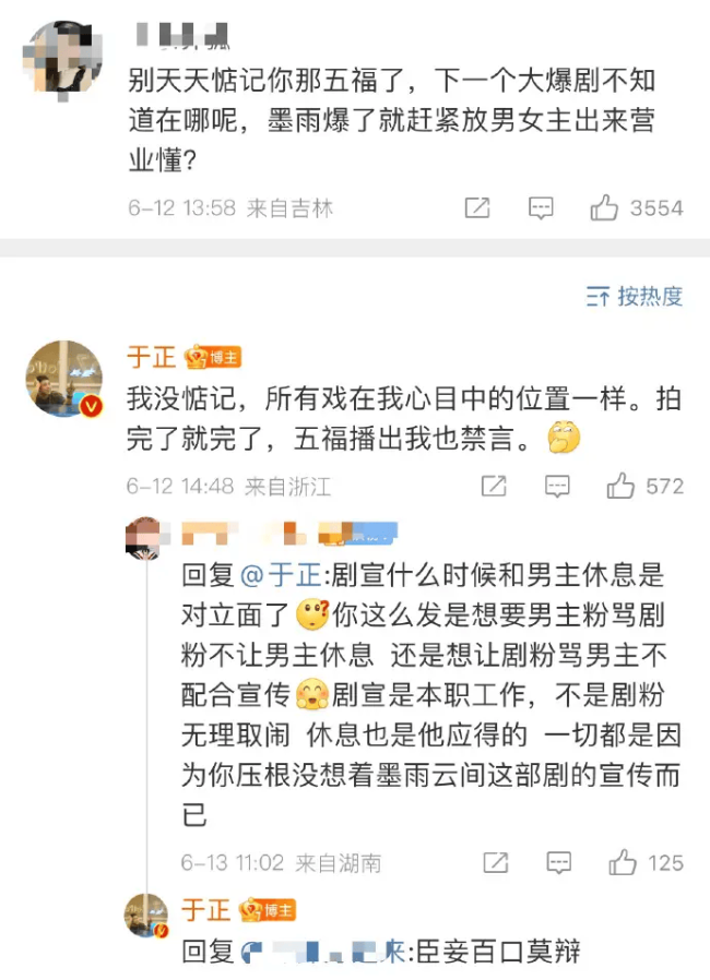 6月13日,有网友在于正社交账号下评论称其更看重《五福临门》,根本没重视《墨雨云间》的剧集宣传,喊话让他赶紧放男女主出来营业。对此,于正回复道:“所有戏在我心目中的位置一样”、“哪有人重视未播剧超过已爆剧的?”,还直接借用《如懿传》中的台词称:“臣妾百口莫辩”。