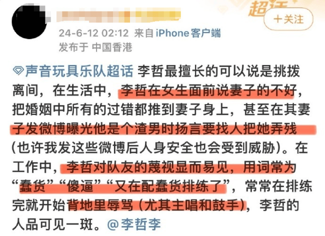 6月12日,乐队“声音玩具”的成员李哲被曝出轨、欺骗女生感情。随后,他发文承认并道歉,同时宣布退出乐队。