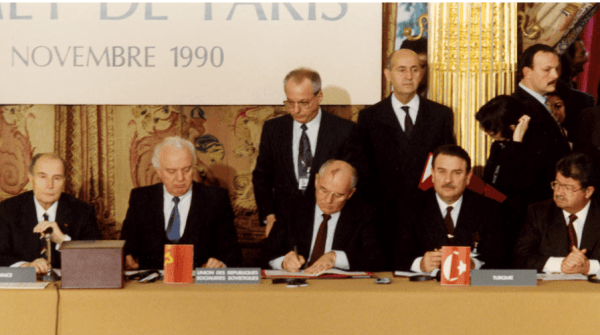 1990 年 11 月 19 日,在巴黎举行的欧洲安全与合作会议首脑会议期间,苏联总统戈尔巴乔夫签署了《欧洲常规武装力量条约》